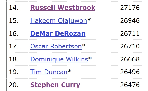 本场赛前,库里历史得分榜距离第19的邓肯还差20分,本场未能完成超越,预计下场将完成超越。